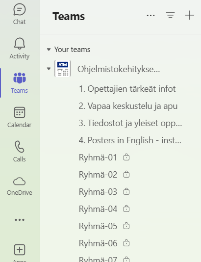 - Tarkista että olet kurssin Teams-kanavalla (pyydä opettajalta pääsy jos et ole). Käytä students.oamk.fi-sähköpostiosoitetta kun kirjaudut Teamssiin